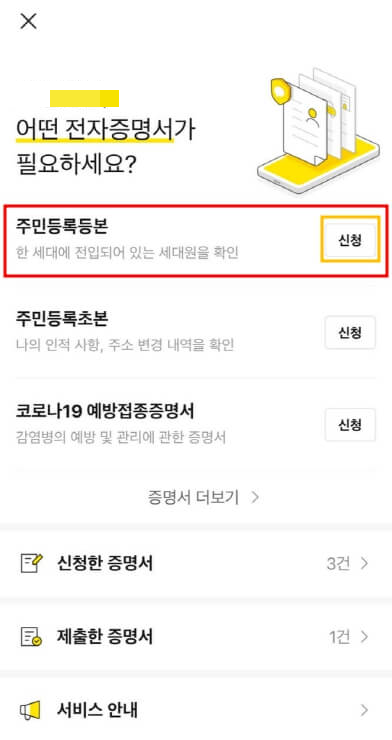 카카오톡에서 주민등록등본 발급하기