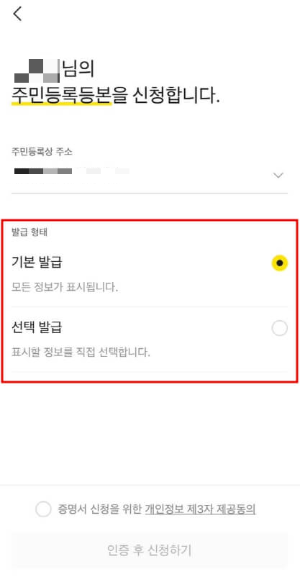 주민등록등본을 선택한 후, 기본발급 또는 선택발급을 고르고, 본인 인증을 완료합니다. 이 과정에서 지문이나 페이스아이디(얼굴 인식)를 통해 빠르고 안전하게 본인 확인이 가능합니다.