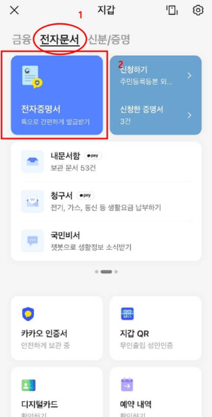 화면 상단에 보이는 지갑 아이콘을 클릭해 전자문서를 확인하고, 여기에서 주민등록등본을 신청할 수 있습니다.